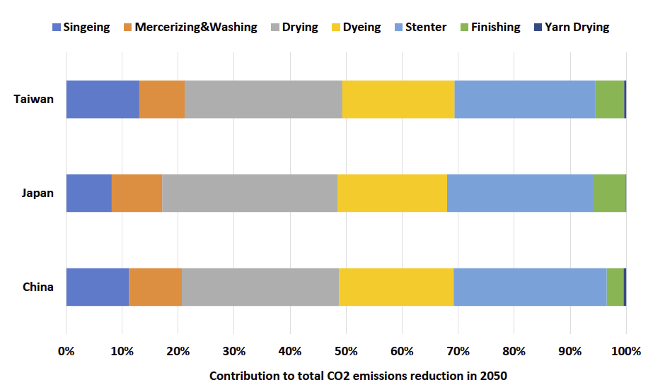 Our analysis for electrification through textile end-use processes shows that around 75% of the CO2 emissions reduction potential in 2050 comes from the electrification of three processes: drying, dyeing, and heat-setting (stenter) (Figure ES2). Around half of the emissions reduction potential comes from the electrification of drying and heat-setting processes. The equipment with electrified heating for these two processes are already commercially available and they can be good candidates to start with for end-use process electrification in textile plants.
