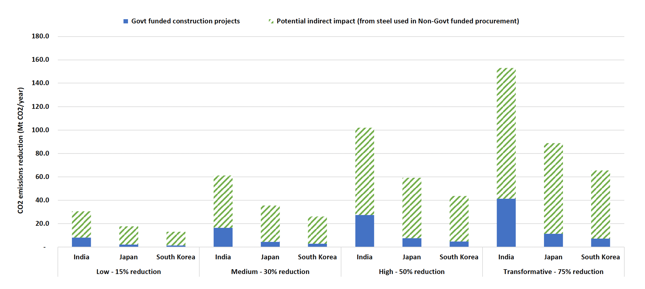 We estimated the CO2 emissions associated with steel used in public construction projects and the potential impact of a GPP policy to reduce those emissions. Public procurement of steel in India, Japan, and South Korea accounted for approximately 55 Mt CO2, 15 Mt CO2, and 10 Mt CO2 emissions in 2019, respectively. Figure 1 shows the annual CO2 emissions reduction potential resulting from GPP of steel in these three countries.