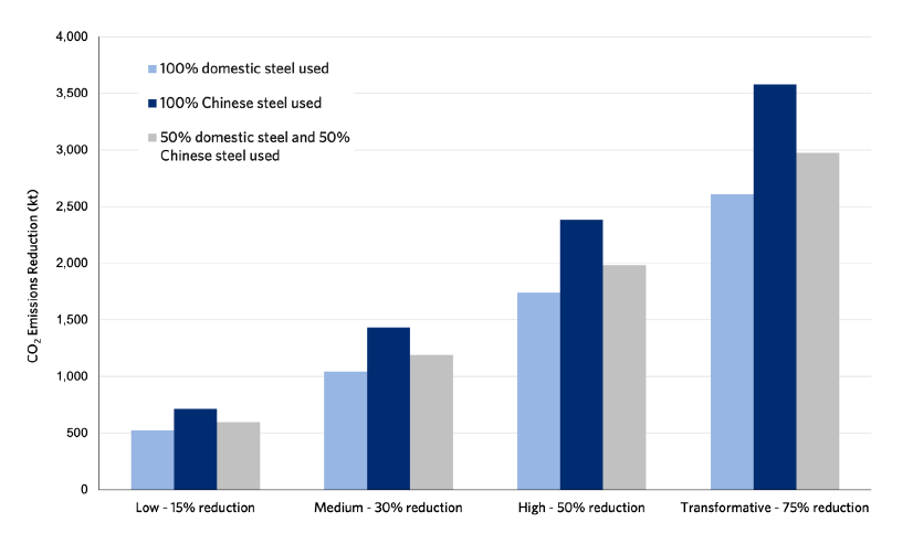 Figure ES2: CO2 Emissions Reduction Potential from Steel Used in Analyzed Transport and Energy Projects under Different Sourcing Scenarios