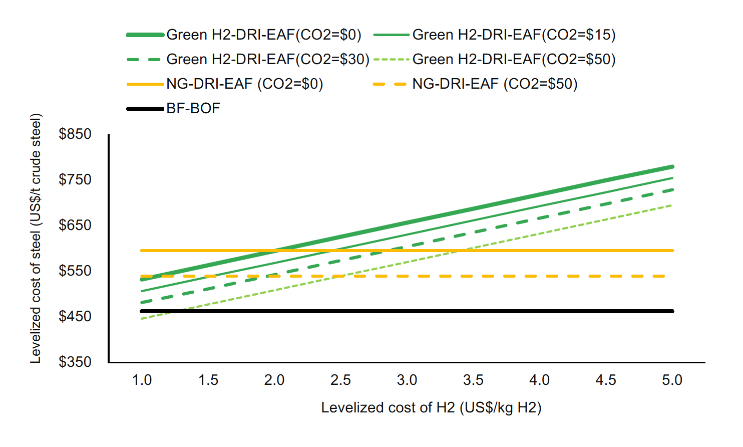 We also analyzed the economic viability of green H₂-DRI-EAF in ASEAN countries by comparing its levelized cost of steel (LCOS) with those of BF-BOF and NG-DRI-EAF routes. Our recent studies find that the LCOS for H₂-DRI-EAF is similar across Southeast Asia’s major steel-producing countries, mainly due to comparable costs for materials, CAPEX, OPEX, and labor. The hydrogen price is the key factor driving LCOS differences. Therefore, this chapter uses Vietnam as a representative case.