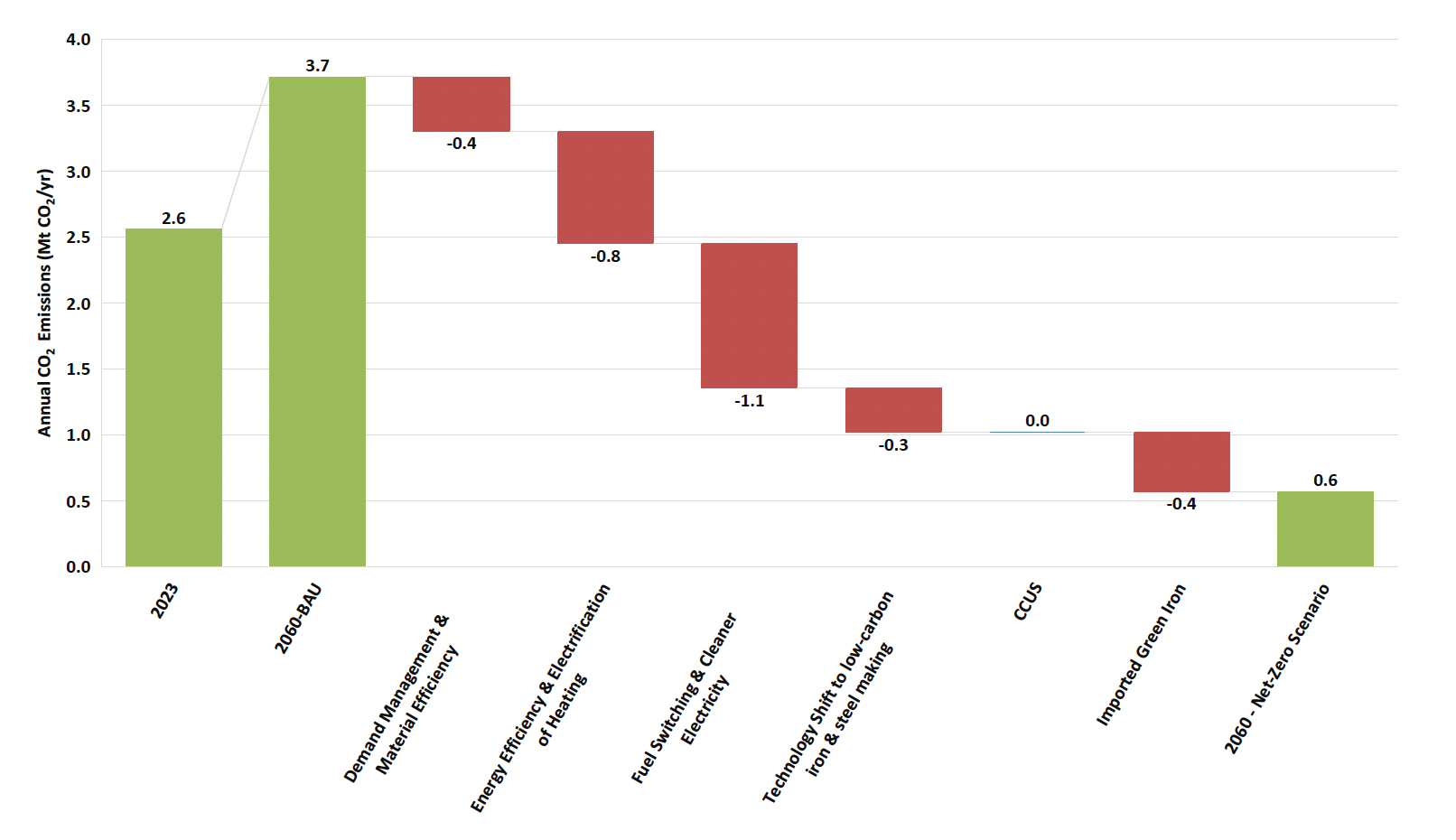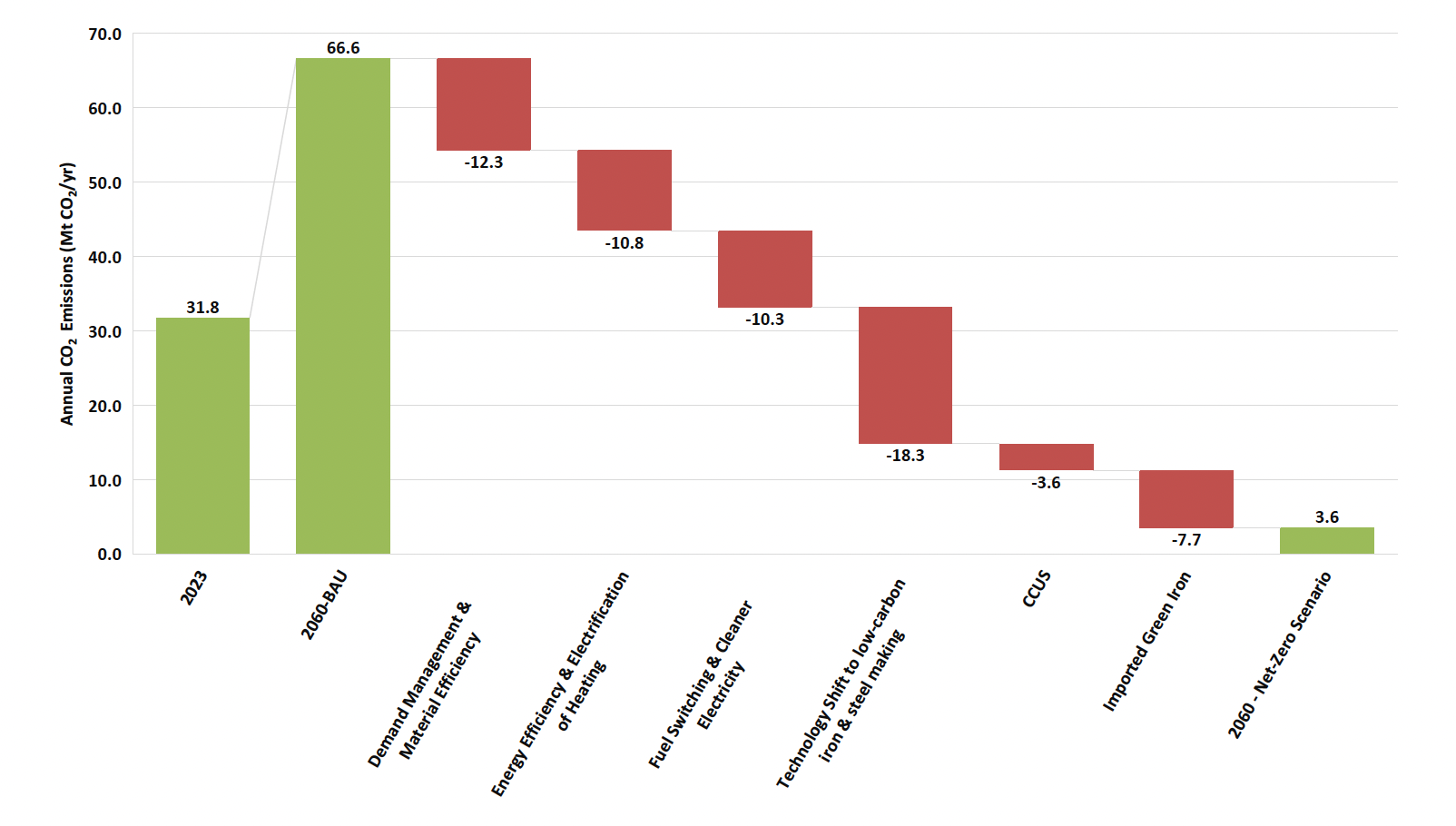 Figure ES4. Impact of each decarbonization pillar on CO2 emissions of Vietnam’s steel industry, Net Zero scenario relative to BAU (Source: this study)