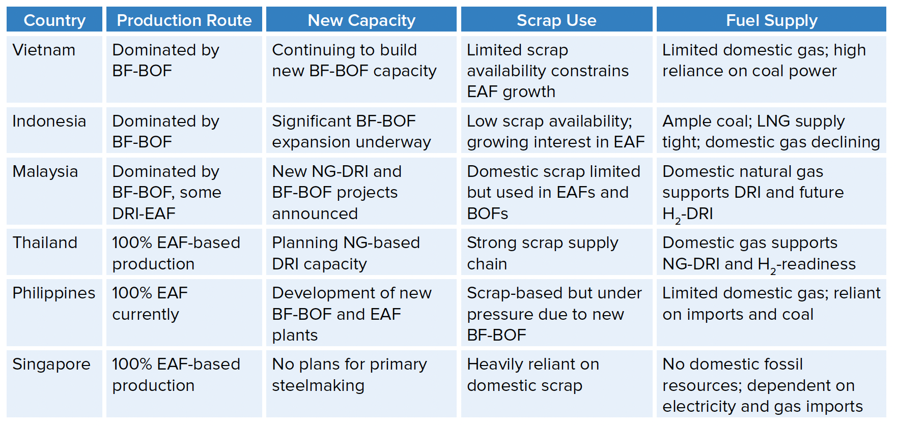 The steel industry in the six ASEAN countries studied differs in terms of technologies used, feedstock options, and expected growth (Table ES1). While some countries continue to rely heavily on coal-based BF-BOF route or are expanding them, others like Thailand and Singapore have entirely EAF-based steelmaking, with Thailand planning on building one NG-DRI. Malaysia falls in the middle, using a mix of BF-BOF and a small capacity of NG-DRI, with growing interest in NG-DRI for EAF routes. Despite these differences, common trends are emerging across the region. To tailor policy and action plans effectively, we group the ASEAN-6 countries into three categories based on the makeup and outlook of their steel sectors. Below, we outline policy recommendations for each group.
