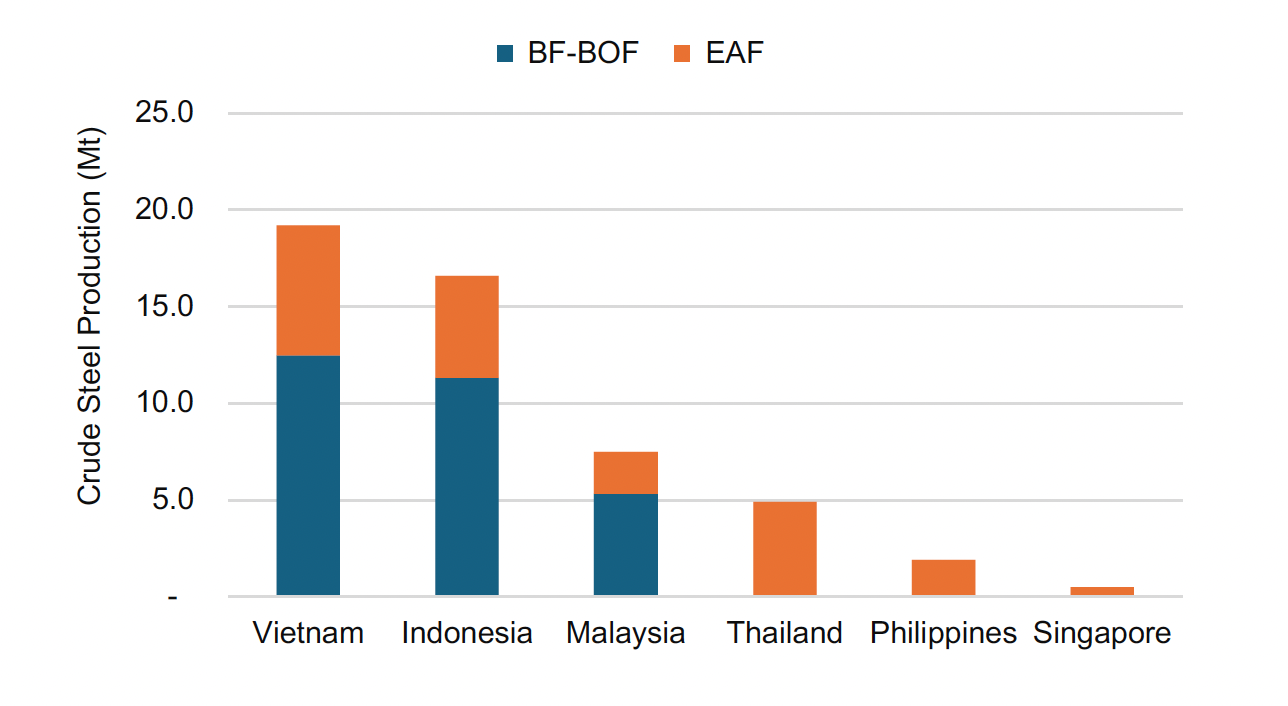 With over 75 million tonnes (Mt) of steel consumption, the combined steel demand of the ASEAN-6 ranks fourth in the world, after China, India, and the U.S. Unlike China, where steel demand is declining, and the U.S., where demand is steady, steel demand in the ASEAN-6 is expected to grow significantly in the coming decades, driven by population growth, urbanization, and ongoing industrial expansion. Vietnam and Indonesia currently lead the region in crude steel output, with Malaysia and Thailand also operating sizable capacities. The Philippines and Singapore have smaller production footprints, though the Philippines is building new primary steelmaking capacity.